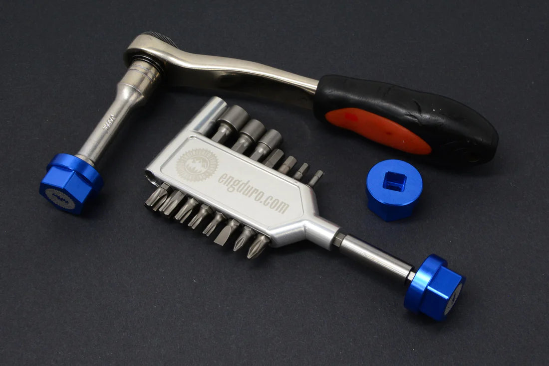 We've wisely designed it with both a 1/4" drive for use in the field with your EngDuro DoubleTrak tool and it also has an integrated 3/8" drive for shop use.