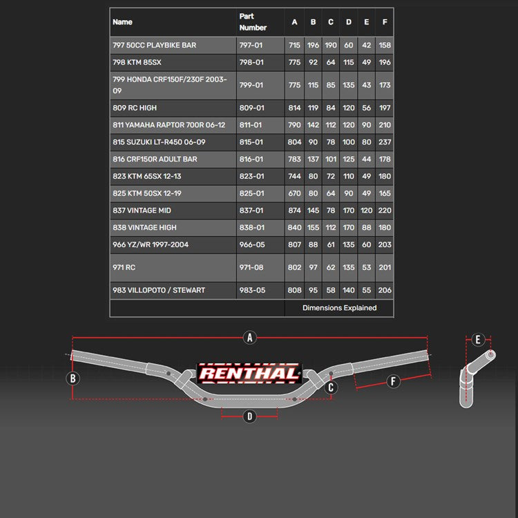 The 7/8in handlebar that started the legacy of Renthal®, created out of the necessity to produce a (7/8in | 22.2mm) dirtbike handlebar that could meet the demands of the worlds best riders, the all aluminum 7/8in handlebar was born. Undergoing a 15 step advanced manufacturing process, using the same 7010 T6 aluminum found in Twinwall and FatBar to reduce vibration transfered to the rider's hands. Combined with a crossbrace to improve stiffness for rider control, and coupled with patented crossbrace clamps, Renthal® 7/8in bars provide riders with the perfect amount of flex while maintaining the strength to resist bending in the event of a crash.